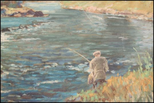 An oak framed oil on board painting / study of a lone fisherman fly fishing with vistas all around