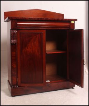 A Victorian mahogany Chiffonier sideboard raised on plinth base with twin doors and single drawer having stage gallery top. Measures: 94cms high x 91cms wide x 40cms deep.