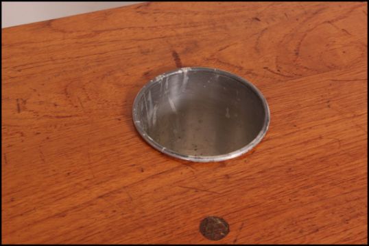 A vintage Industrial solid wood school science laboratory table bench desk with polished metal drop cups - ideal as a kitchen island - breakfast bar 92cm high, 152cm wide, 76cm deep