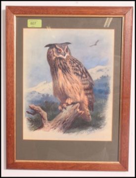 After Archibald Thorburn framed and glazed print of an Eagle Owl with mountain scape to background. Signed to corner. Measures 24cms x 30cms