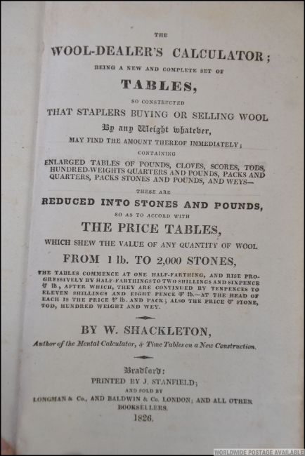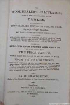 The wool-dealer’s calculator; being a new and complete set of tables, so constructed that staplers buying or selling wool by any weight whatever, may find the weight thereof immediately; SHACKLETON, W. 1826 FIRST EDITION. Original green cloth, 252pp.