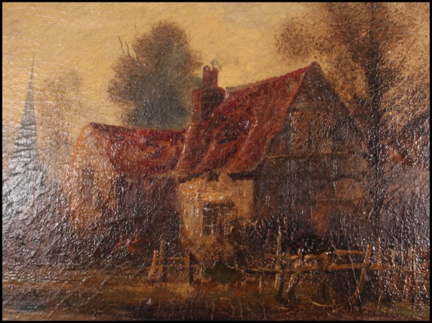 Believed Alex Jamieson. An oil on canvas painting of a thatched cottage scene with wooded surroundings, signed to the corner. Together with another similiar oil painting with illegible signature, possible the same artist. Each with gallery labels to verso respectively B48 & B49. Each measuring 49cms x36cms and matching gilt frames.
