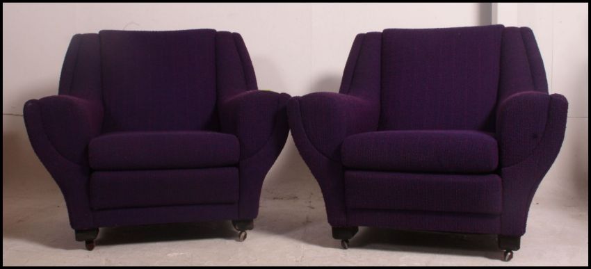A stunning mid century Thomas Co ( McGregor of Scotland ) 3 piece suite comprising sofa and 2 armchairs, all of angular from and upholstered in the original Scottish purple wool / tweed . Measures: 80cms high x 185cms wide x 90cms deep.