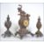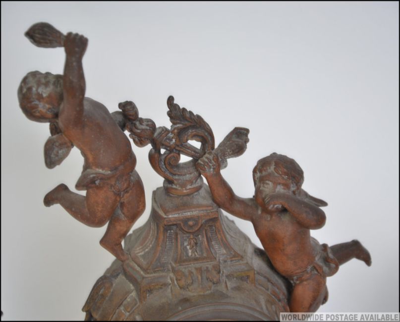 A 19th century French 3 piece marble and spelter clock garniture. The cylinder head clock over plinth being adorned by classical cherub / putti. Each garniture of with twin handled urns on plinth bases. Measure: 40cms high.