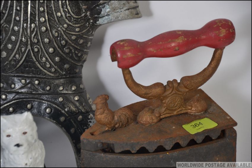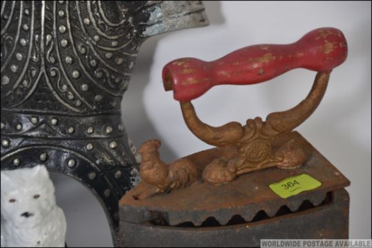 A collection of metal items to include a Black and White pub advertising cast metal dog ornament, a vintage cast iron along with a cast front Knights armour. Measures: 50cms high.
