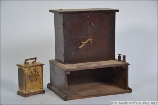 A 20th century oak cased Industrial factory slave clock having a roman numeral chapter ring along with a brass cased carriage clock of smaller proportions. Measures: 23cms high.