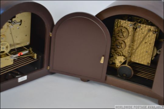 Two 20th century oak cased mantle clocks one with an engraved plaque with notation for British Rail. Measures: 50cms wide.