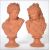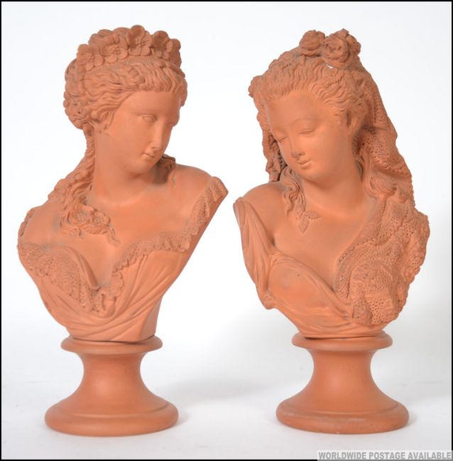 A pair of 19th / 20th century clay figural busts raised on a socle plinth base, of young scantily clad veiled women signed to the base TOROUAI. Measures: 24cms high.