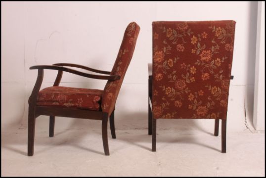 A pair of CC41 utility marked Mid century fireside armchairs of beech construction having original moquette cushions being marked CC41. Measures 92cms x 60cms