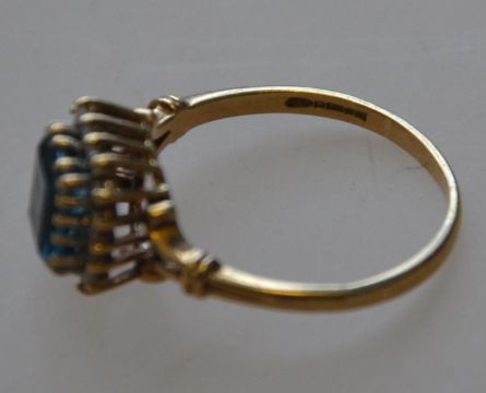 A hallmarked 9ct gold ladies dress ring with a large central blue stone and diamond surround 3.1g RS T