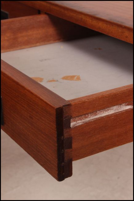 A retro 20th century industrial office factory teak wood desk having two drawers to the front raised on square tubular metal legs. Measure: 73cms high x 122cms wide x 69cms deep.