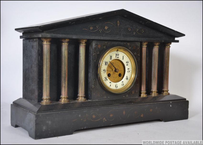 A 19th century large slate mantel clock with 8 day Japy Freres brass movement. The oversized case with columns and decorative face to centre. The central gilt dial with notation. Measures: 33cms high x 52cms wide x 18cms deep.