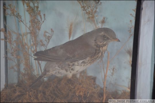 A taxidermy example of a Thrush songbird set to a naturalistic plinth and within glass case. Measure: 36cms high x 35cms wide x 14cms deep.