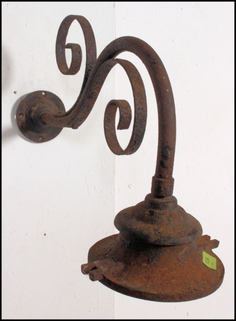 A vintage 20th century industrial factory metal factory external light fixture having wrought iron scroll work. Measure: 37cms high x 53cms diameter.
