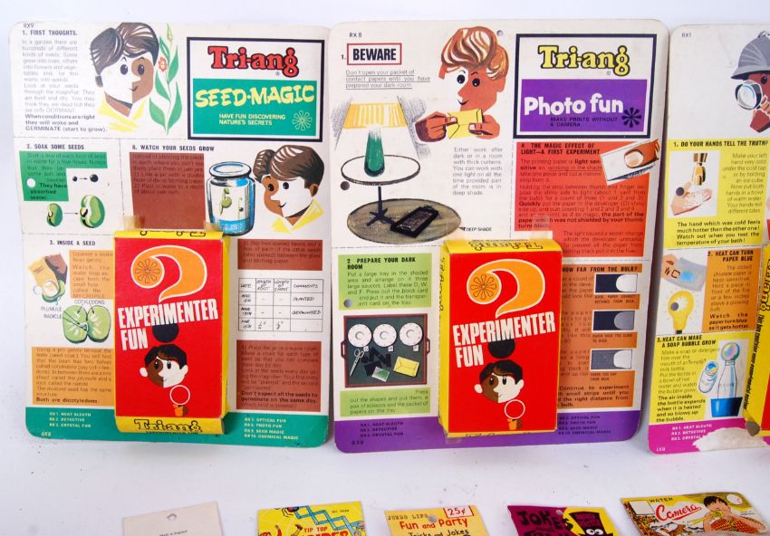TRIANG EXPERIMENTER: A collection of 4x rare Triang made ' Experimenter Fun ' sets, along with a quantity of 1950's / 1960's jokeshop and related novelties. All unused, original packets etc. Rare.