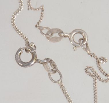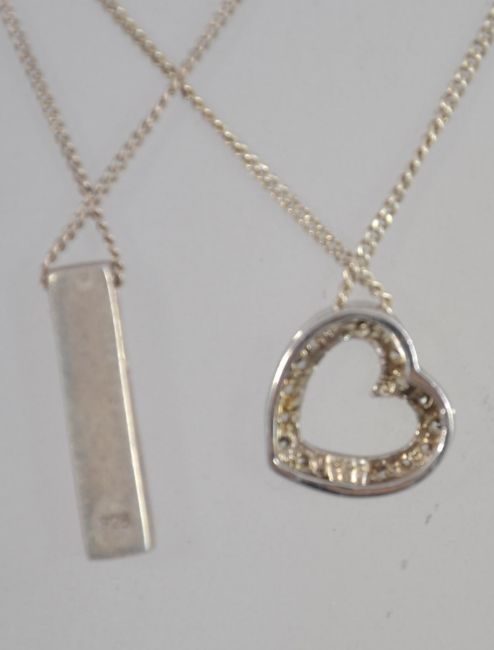 2 silver contemporary necklace and pendants to include heart shaped with inset cz stones and a square drop pendant. Sizes 40cms & 38cms. Combined weight 6.9g