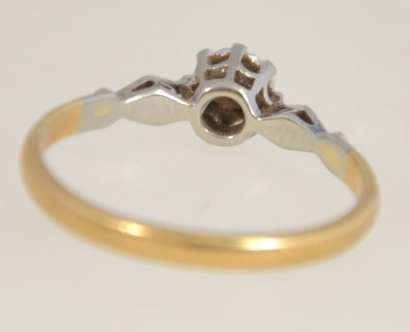 An 18ct gold and platinum vintage ladies ring having central claw illustion set diamond approx 5pnts . Size M / Weight .5pnts