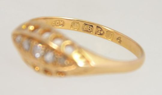 An Edwardian 18ct gold and diamond vintage ladies ring bearing Chester hallmarks for 1909. The ring with channel set stones approx 15pnts total.
