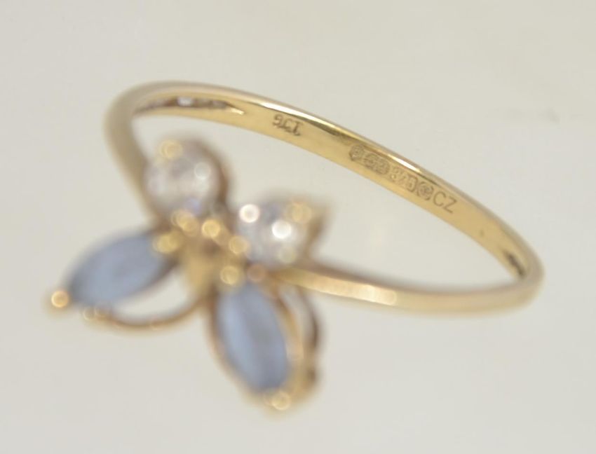 A 9ct gold hallmarked ladies butterfly ring inset with CZ stones. Hallmarked for Sheffield. Size V / Weight 2.2g