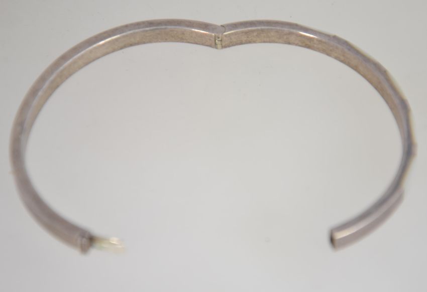 A silver and mother of pearl inlaid bangle being stamped 925 with push clasp. Size 7cms / weight 12g