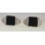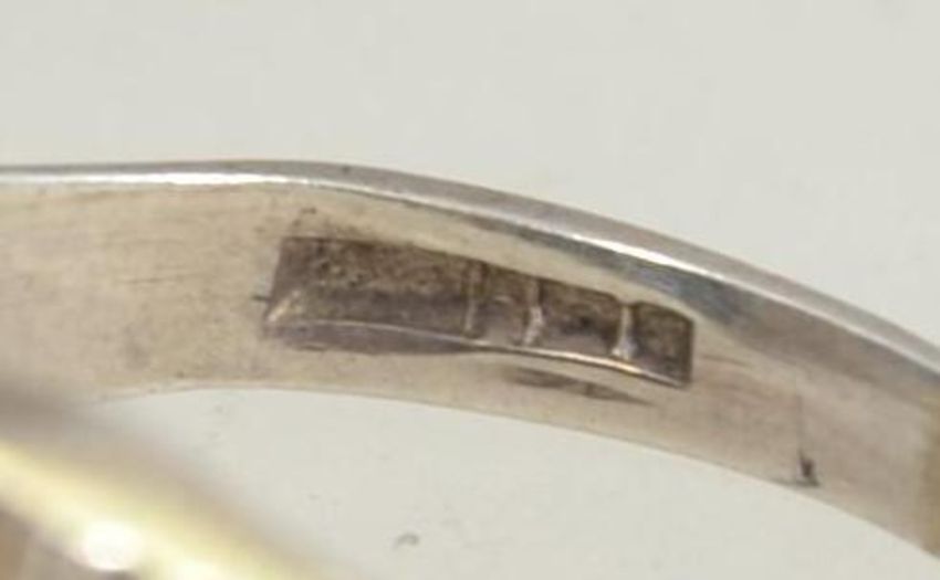 A pair of silver and labrodite signed rings, hallmarked for Birmingham, marks partially legible. Square cut labrodite with chased shoulders. Size T&V, total weight 7.3g