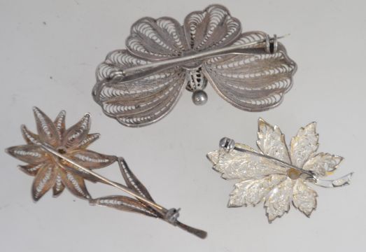3 silver 925 ladies vintage filigree work brooched, 1 a butterfly, the others being flowers. Total weight 18g / Largest cms 5.5cms