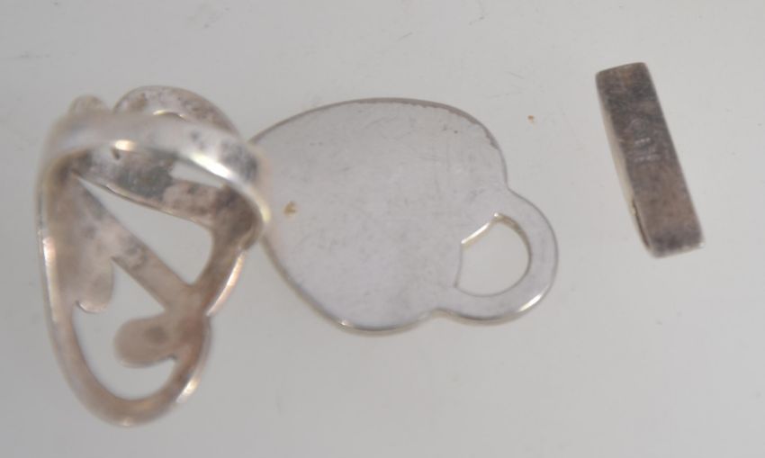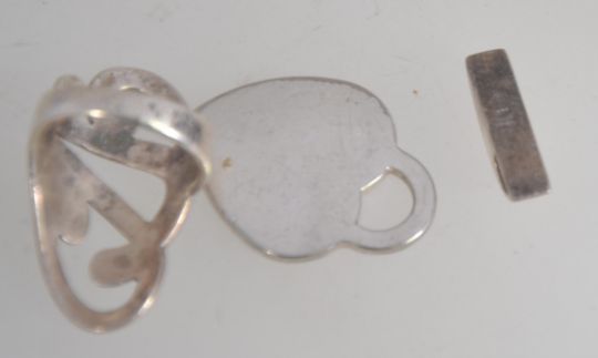 A silver rococo dress ring of large form ( length 3cms) together with a contemporary silver necklace pendant and a heart pendant marked Tifany. Total combined weight 17.7g / ring size L