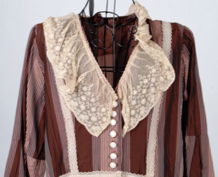EDWARDIAN: Edwardian two piece button front outfit with lace detailing . Skirt has bustle to rear and a straight train NOTE: From a large private collection of assorted theatrical costumes, fancy dress outfits and vintage fashion. Ex- Dauphines Costume Hire of Bristol. Many of the theatrical costumes are relics of TV / Film history (some appearing in TV shows as far back as the 1950's), and also of both professional and amateur stage performances. CONDITION: Condition of most items is good. Theatrical items will show signs of expected wear and tear through use, but most are generally very good. Buyers are reminded for the need to satisfy themselves as to condition of items prior to bidding, as condition on some, will vary. SIZING: Sizing, where present on the garment is given. Other sizes stated are to be taken as an approximation only. Where no size is listed, no sizing information is available, although for reference, our display mannequin is a small/medium built. VIEWING: The costumes and items from this sale will be available for viewing on Weds 7th September from 9am - 7pm. They are in a separate location to our usual sales so please ask at reception. Viewing at other times is available, but strictly by appointment only. POSTING / COLLECTION: UK postage will be £15.99+VAT per parcel, Europe from £19.99+VAT. Rest of the world, please contact us for a quote. We're happy to combine items (a 'parcel' will typically hold 2-5 costumes). Collection welcome at our premises any time within 7 days after the sale.