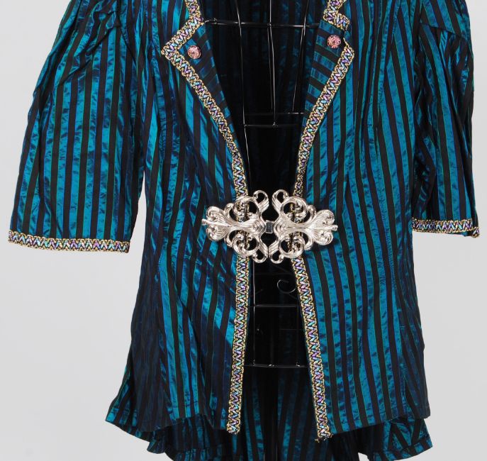 TAILCOAT: A satin striped tunic jacket / tailcoat with white metal clasp . Fitted and buttoned to waist at rear with short pleated ' tail ' NOTE: From a large private collection of assorted theatrical costumes, fancy dress outfits and vintage fashion. Ex- Dauphines Costume Hire of Bristol. Many of the theatrical costumes are relics of TV / Film history (some appearing in TV shows as far back as the 1950's), and also of both professional and amateur stage performances. CONDITION: Condition of most items is good. Theatrical items will show signs of expected wear and tear through use, but most are generally very good. Buyers are reminded for the need to satisfy themselves as to condition of items prior to bidding, as condition on some, will vary. SIZING: Sizing, where present on the garment is given. Other sizes stated are to be taken as an approximation only. Where no size is listed, no sizing information is available, although for reference, our display mannequin is a small/medium built. VIEWING: The costumes and items from this sale will be available for viewing on Weds 7th September from 9am - 7pm. They are in a separate location to our usual sales so please ask at reception. Viewing at other times is available, but strictly by appointment only. POSTING / COLLECTION: UK postage will be £15.99+VAT per parcel, Europe from £19.99+VAT. Rest of the world, please contact us for a quote. We're happy to combine items (a 'parcel' will typically hold 2-5 costumes). Collection welcome at our premises any time within 7 days after the sale.