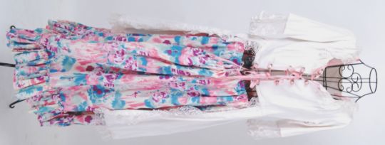 DRESDEN: An 18th Century Dresden style outfit . Top coat has long tails , lace trim , and pink satin roses to the front with a corset style tie fastening . NOTE: From a large private collection of assorted theatrical costumes, fancy dress outfits and vintage fashion. Ex- Dauphines Costume Hire of Bristol. Many of the theatrical costumes are relics of TV / Film history (some appearing in TV shows as far back as the 1950's), and also of both professional and amateur stage performances. CONDITION: Condition of most items is good. Theatrical items will show signs of expected wear and tear through use, but most are generally very good. Buyers are reminded for the need to satisfy themselves as to condition of items prior to bidding, as condition on some, will vary. SIZING: Sizing, where present on the garment is given. Other sizes stated are to be taken as an approximation only. Where no size is listed, no sizing information is available, although for reference, our display mannequin is a small/medium built. VIEWING: The costumes and items from this sale will be available for viewing on Weds 7th September from 9am - 7pm. They are in a separate location to our usual sales so please ask at reception. Viewing at other times is available, but strictly by appointment only. POSTING / COLLECTION: UK postage will be £15.99+VAT per parcel, Europe from £19.99+VAT. Rest of the world, please contact us for a quote. We're happy to combine items (a 'parcel' will typically hold 2-5 costumes). Collection welcome at our premises any time within 7 days after the sale.