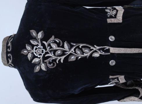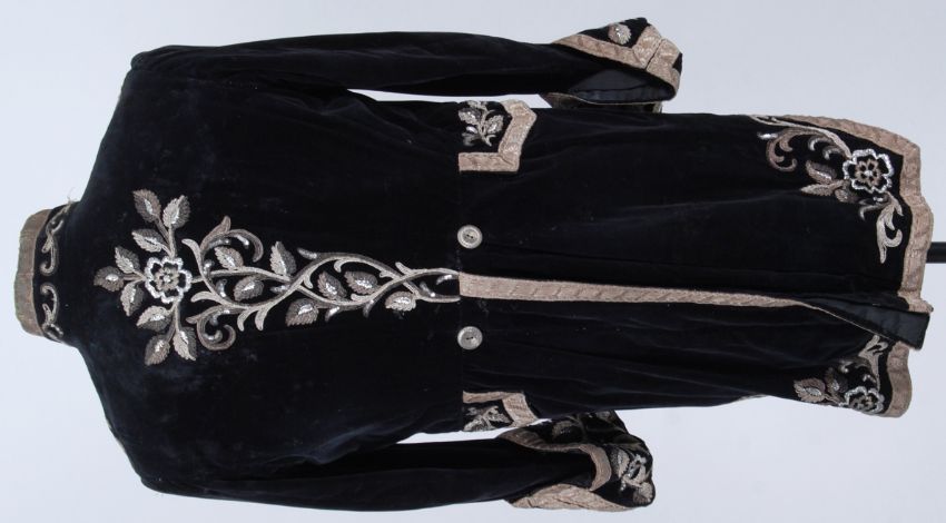 TAIL COAT: An ambassadors tail coat , black velvet with nehru style collar . Hand stitched floral applied silver thread embroidery with silver brocade edging tape . Decoration to front and rear with buttons to rear at fitted waistline . NOTE: From a large private collection of assorted theatrical costumes, fancy dress outfits and vintage fashion. Ex- Dauphines Costume Hire of Bristol. Many of the theatrical costumes are relics of TV / Film history (some appearing in TV shows as far back as the 1950's), and also of both professional and amateur stage performances. CONDITION: Condition of most items is good. Theatrical items will show signs of expected wear and tear through use, but most are generally very good. Buyers are reminded for the need to satisfy themselves as to condition of items prior to bidding, as condition on some, will vary. SIZING: Sizing, where present on the garment is given. Other sizes stated are to be taken as an approximation only. Where no size is listed, no sizing information is available, although for reference, our display mannequin is a small/medium built. VIEWING: The costumes and items from this sale will be available for viewing on Weds 7th September from 9am - 7pm. They are in a separate location to our usual sales so please ask at reception. Viewing at other times is available, but strictly by appointment only. POSTING / COLLECTION: UK postage will be £15.99+VAT per parcel, Europe from £19.99+VAT. Rest of the world, please contact us for a quote. We're happy to combine items (a 'parcel' will typically hold 2-5 costumes). Collection welcome at our premises any time within 7 days after the sale.
