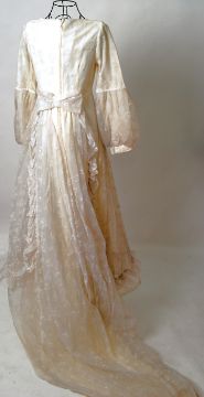 WEDDING DRESS: An original vintage 1970's lace full length with train 'Empire Line' wedding dress . Floral embroidery to lace - all in ivory. NOTE: From a large private collection of assorted theatrical costumes, fancy dress outfits and vintage fashion. Ex- Dauphines Costume Hire of Bristol. Many of the theatrical costumes are relics of TV / Film history (some appearing in TV shows as far back as the 1950's), and also of both professional and amateur stage performances. CONDITION: Condition of most items is good. Theatrical items will show signs of expected wear and tear through use, but most are generally very good. Buyers are reminded for the need to satisfy themselves as to condition of items prior to bidding, as condition on some, will vary. SIZING: Sizing, where present on the garment is given. Other sizes stated are to be taken as an approximation only. Where no size is listed, no sizing information is available, although for reference, our display mannequin is a small/medium built. VIEWING: The costumes and items from this sale will be available for viewing on Weds 7th September from 9am - 7pm. They are in a separate location to our usual sales so please ask at reception. Viewing at other times is available, but strictly by appointment only. POSTING / COLLECTION: UK postage will be £15.99+VAT per parcel, Europe from £19.99+VAT. Rest of the world, please contact us for a quote. We're happy to combine items (a 'parcel' will typically hold 2-5 costumes). Collection welcome at our premises any time within 7 days after the sale.