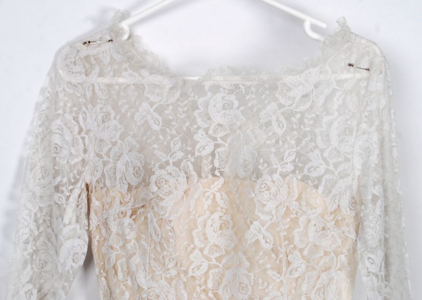 WEDDING DRESS: A vintage original lace and net wedding dress with an extra long train. Full length sleeve with high scoop neck and fitted waist. NOTE: From a large private collection of assorted theatrical costumes, fancy dress outfits and vintage fashion. Ex- Dauphines Costume Hire of Bristol. Many of the theatrical costumes are relics of TV / Film history (some appearing in TV shows as far back as the 1950's), and also of both professional and amateur stage performances. CONDITION: Condition of most items is good. Theatrical items will show signs of expected wear and tear through use, but most are generally very good. Buyers are reminded for the need to satisfy themselves as to condition of items prior to bidding, as condition on some, will vary. SIZING: Sizing, where present on the garment is given. Other sizes stated are to be taken as an approximation only. Where no size is listed, no sizing information is available, although for reference, our display mannequin is a small/medium built. VIEWING: The costumes and items from this sale will be available for viewing on Weds 7th September from 9am - 7pm. They are in a separate location to our usual sales so please ask at reception. Viewing at other times is available, but strictly by appointment only. POSTING / COLLECTION: UK postage will be £15.99+VAT per parcel, Europe from £19.99+VAT. Rest of the world, please contact us for a quote. We're happy to combine items (a 'parcel' will typically hold 2-5 costumes). Collection welcome at our premises any time within 7 days after the sale.