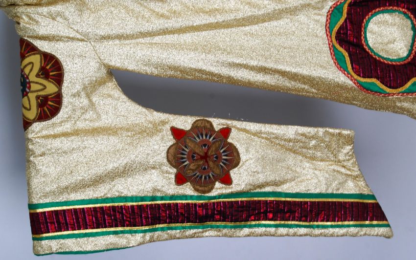 MIKADO: A Mikado Emporer style gown , with skirt and obi , fully lined with gold Lame and applied and embroidered multi colour patches. NOTE: From a large private collection of assorted theatrical costumes, fancy dress outfits and vintage fashion. Ex- Dauphines Costume Hire of Bristol. Many of the theatrical costumes are relics of TV / Film history (some appearing in TV shows as far back as the 1950's), and also of both professional and amateur stage performances. CONDITION: Condition of most items is good. Theatrical items will show signs of expected wear and tear through use, but most are generally very good. Buyers are reminded for the need to satisfy themselves as to condition of items prior to bidding, as condition on some, will vary. SIZING: Sizing, where present on the garment is given. Other sizes stated are to be taken as an approximation only. Where no size is listed, no sizing information is available, although for reference, our display mannequin is a small/medium built. VIEWING: The costumes and items from this sale will be available for viewing on Weds 7th September from 9am - 7pm. They are in a separate location to our usual sales so please ask at reception. Viewing at other times is available, but strictly by appointment only. POSTING / COLLECTION: UK postage will be £15.99+VAT per parcel, Europe from £19.99+VAT. Rest of the world, please contact us for a quote. We're happy to combine items (a 'parcel' will typically hold 2-5 costumes). Collection welcome at our premises any time within 7 days after the sale.