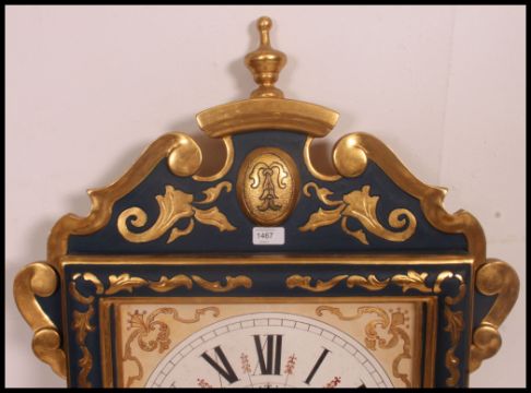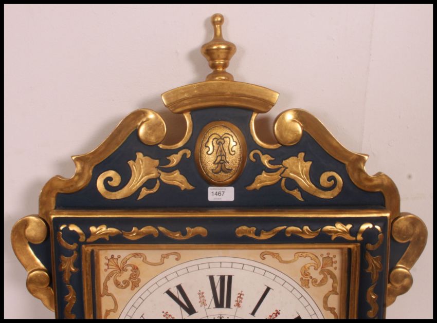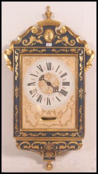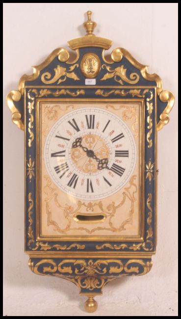 A beautiful French blue and gilt wall clock with roman numeral chapter ring, faceted hands. All in the Rococo style with finial top and inverted finial underside