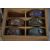 Wooden divided box containing five cloisonne napkin rings, two intricately carved dogs of Foo , a jade like puzzle ball ( 6 ), Japanese monogrammed paperweight along with a brass fish / carp door knocker Ball H10cm