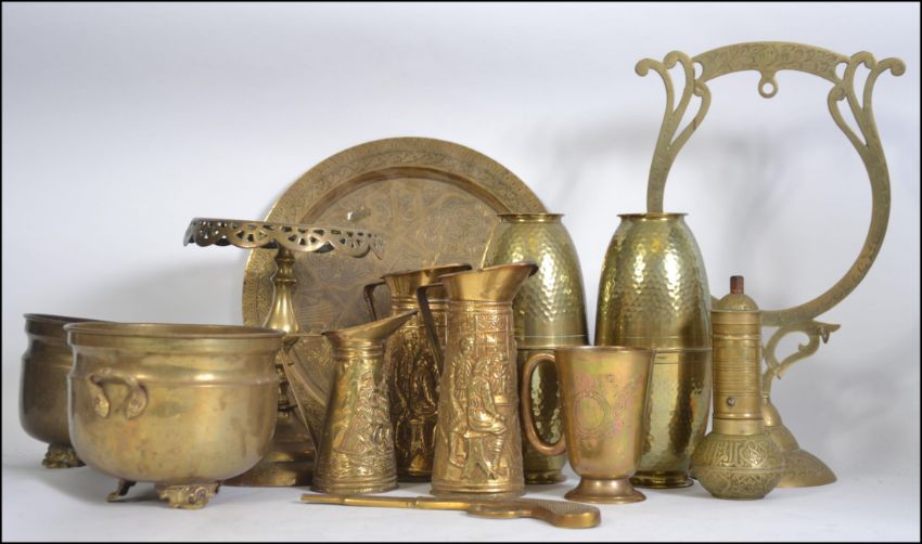 A large collection of brass wares to include stands, tall trivets, ornaments, vases, bowls and many other items etc