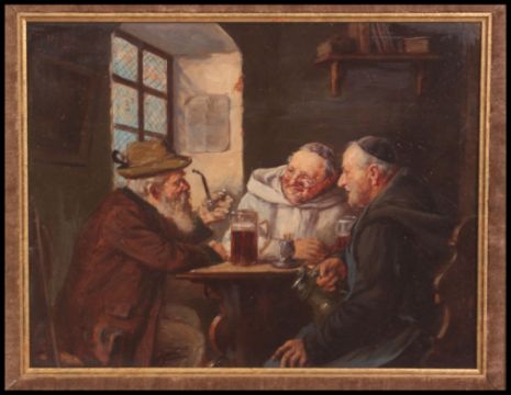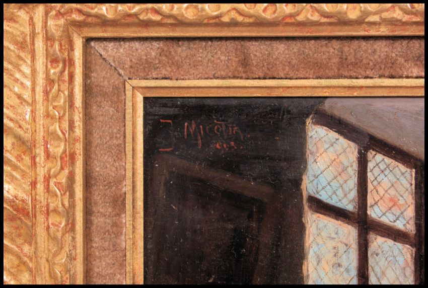 Continental School J. Micotta Dutch artist, early 20th Century painting depicting three figures seated within an interior tavern setting sat at a table, oil on board, 20x25cm, indistinctly signed, J. Micotta, and dated 1903, framed in a decorative gilt frame