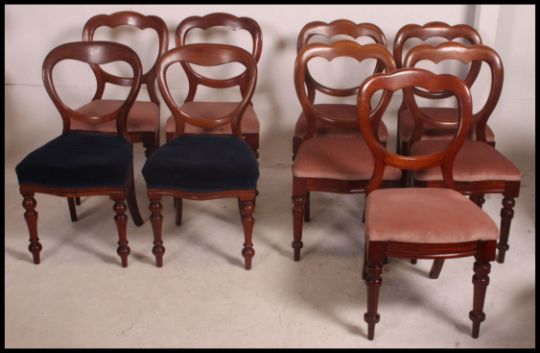 A set of 8 Victorian mahogany balloon back dining chairs being raised on turned legs with velour overstuffed seats and balloon shaped back rests
