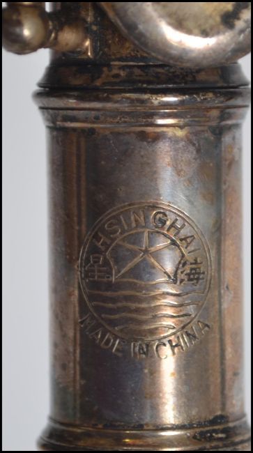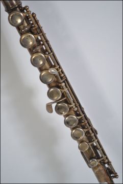 A 20th century Chinese made chrome flute with mother of pearl buttons makers name engraved on the flute