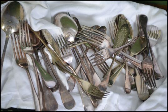 An Edwardian oak canteen of cutlery being baize lined together with loose cutlery believed to be the contents of the canteen
