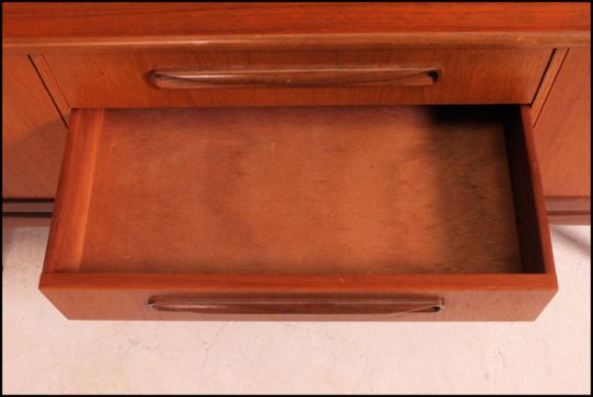 A retro 20th century teak wood display / sideboard. 121cm high x 188cm wide x 46cm deep.