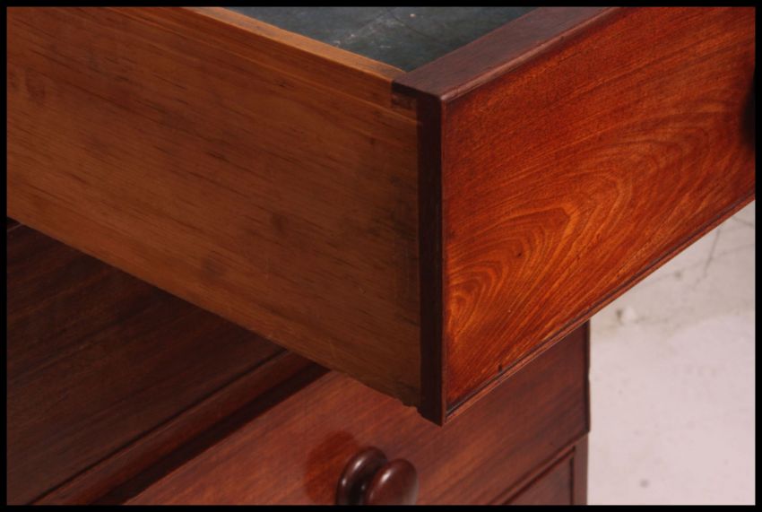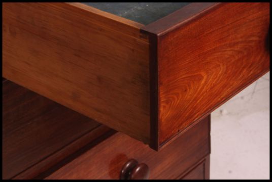 A Good Victorian mid 19th century flame mahogany 2 over 3 chest of drawers. Raised on turned legs with 2 over 3 configuration, each drawers with knob handles and flared top above. 114cm high x 116cm wide x 57cm deep