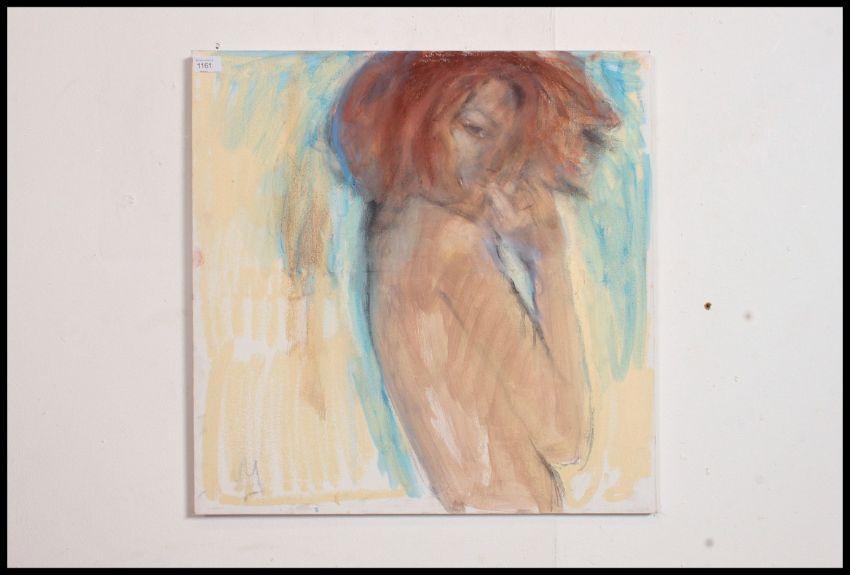 MICHAEL COOTE (b1931); A 20th century oil / gouache on canvas painting study of a nude female in a crouching position. Signed to the corner being sold by the artists family. Measures 61cms x 61cmsMichael Coote studied as a photo lithographer, and is often credited as 'colour illustrator' on contemporary Sherlock Holmes publications being well renowned and a listed artist of some repute.61cm high x 61cm wide