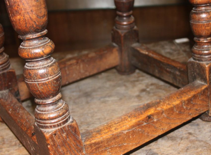 A 17th / 18th century country oak peg jointed stool raised on gun barrel turned legs united by square peripheral legs having fitted frieze with flared top seat