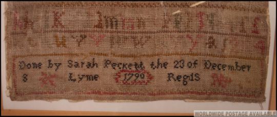 A framed and glazed George III era needlepoint numerals and alphabet sampler. With the inscription to the bottom ' Done by Sarah Beckett on the 23 of December 1790 Lyme Regis '
