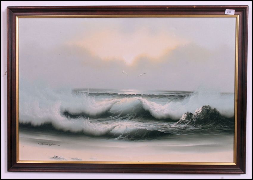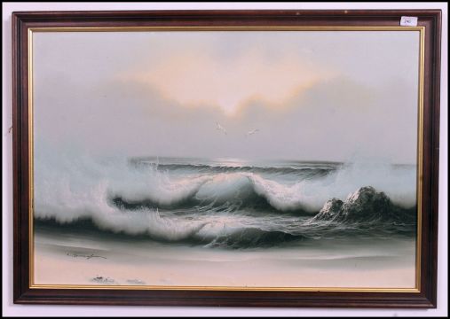 A framed oil on canvas of seagull's over crashing waves signed to the corner C Tommy ? please see images