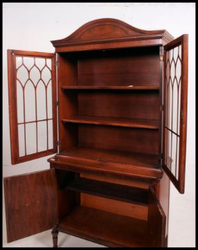 A Federal revival mahogany library bookcase display cabinet raised on turned legs with flame mahogany cupboard having twin door astragal glazed bookcase cabinet atop. 177cm high x 92cm wide x 44cm deep