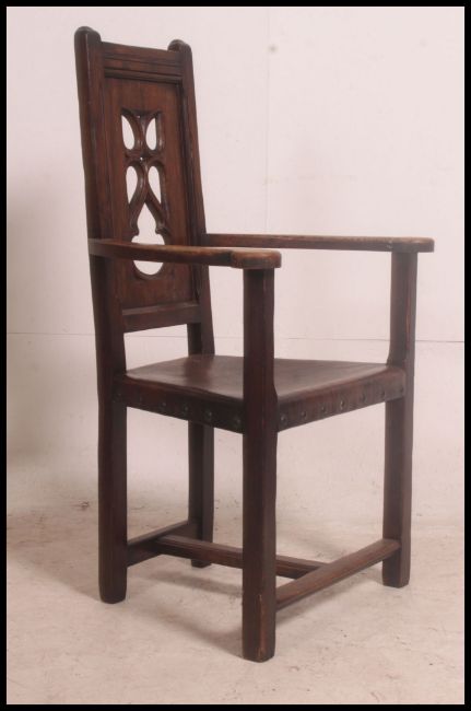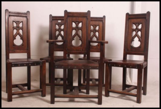 A set of 5 19th century Arts & Crafts oak and leather eclesiastical pugin type dining chairs. The heavy oak with canted detailing having thick tan leather seats with pierced gothic style panel back rests. 111cm high x 66cm wide x 51cm deep