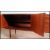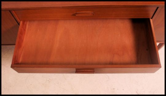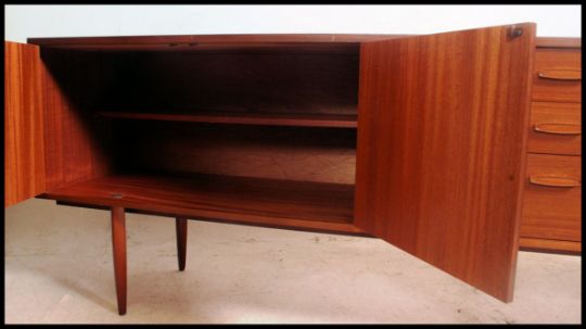 A retro teak wood long sideboard of Danish influence, having a a run of three central drawers flanked by double swing doors and a fall front raised on tapered legs . 78cm high x 203cm wide x 43cm deep.